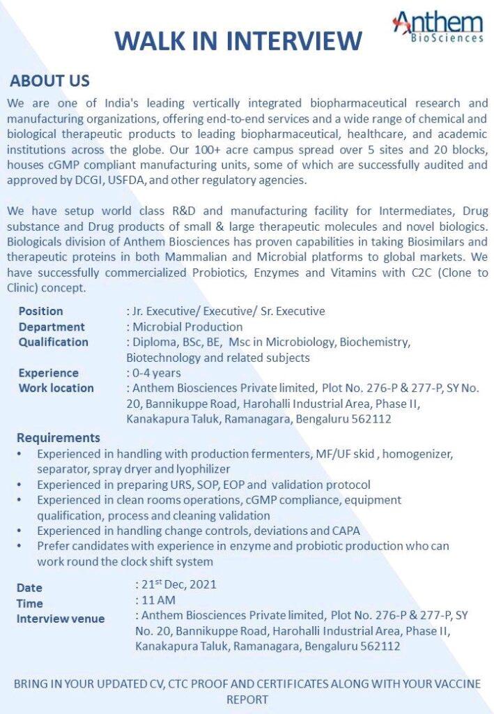 Anthem Biosciences Private Limited. Walk In Interview for Freshers & Experience Diploma, B.Sc, BE,M.Sc in Biological Manufacturing Department on 21st Dec’21