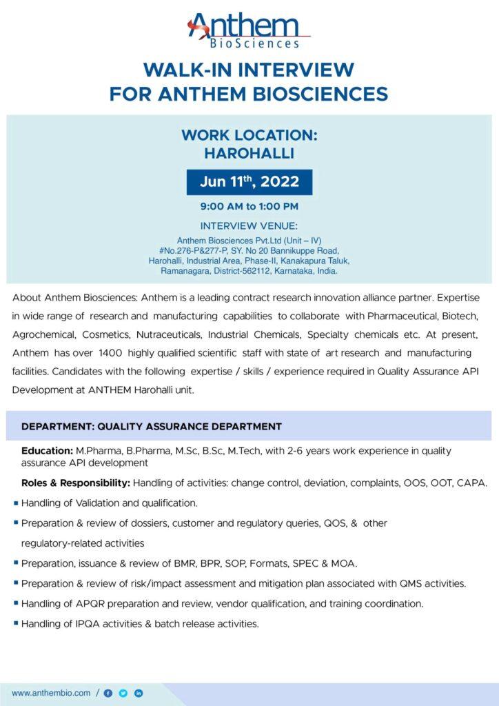 Anthem Biosciences Private Limited Walk In Interview for Quality Assurance Department on Jun 11th, 2022