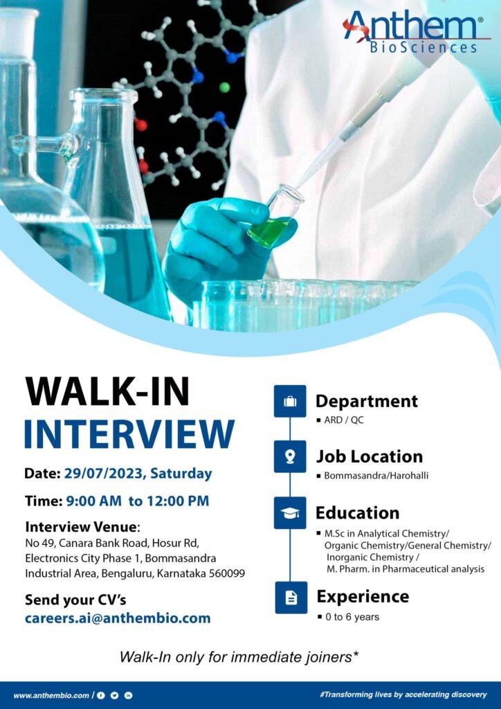 Anthem Biosciences- Walkin-interview for ARD/ QC Department on 29/07/2023