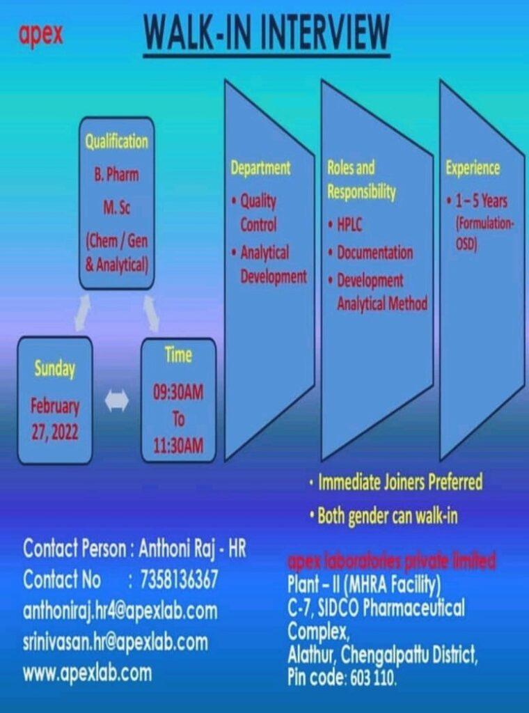 Apex Laboratories Walk in interview for Quality Control & Analytical Development Department on Sunday, February 27, 2022