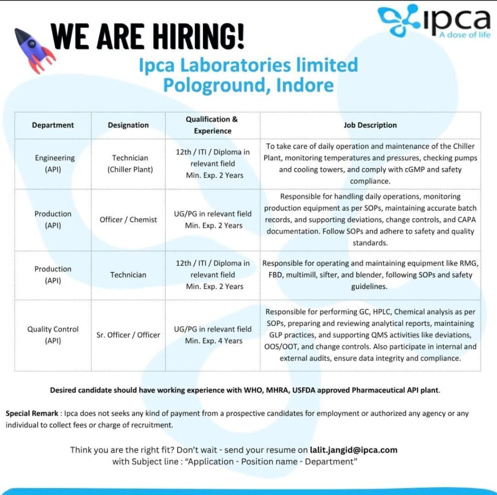 Ipca Laboratories Limited, a leading name in the pharmaceutical industry, is actively hiring experienced professionals for its API (Active Pharmaceutical Ingredient) plant located in Pologround, Indore.