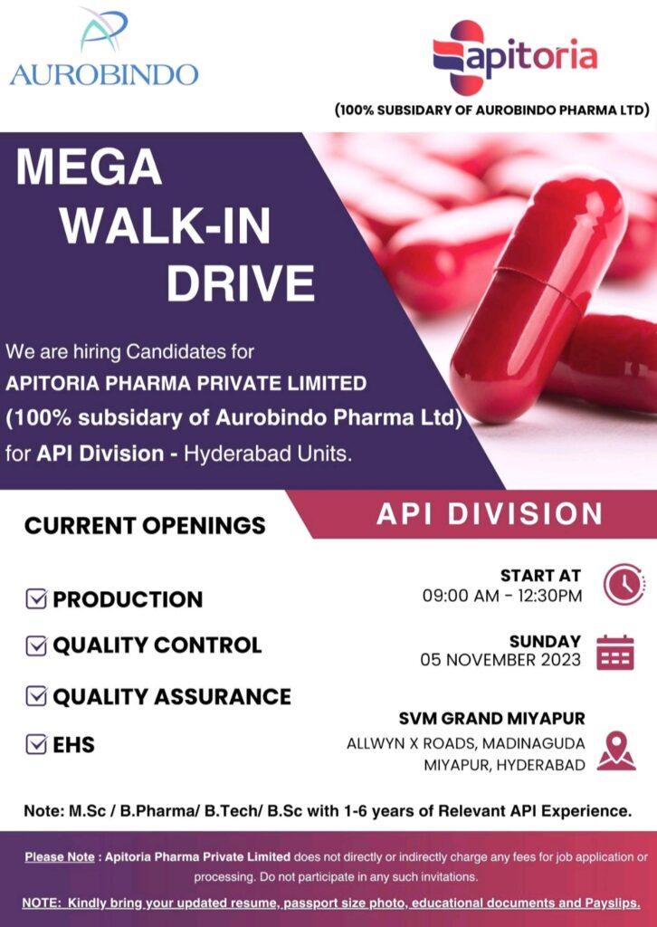 Apitoria Pharma walk in interview for Production, QA, QC & EHS department on 05 November 2023