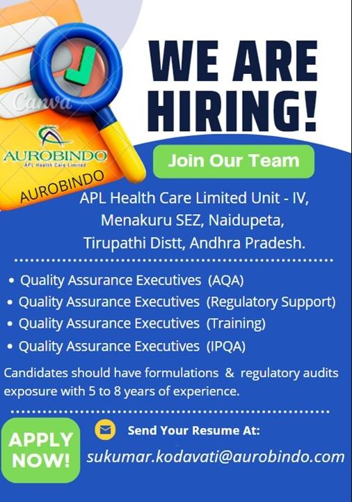 Candidates should have formulations & regulatory audits exposure with 5 to 8 years of experience