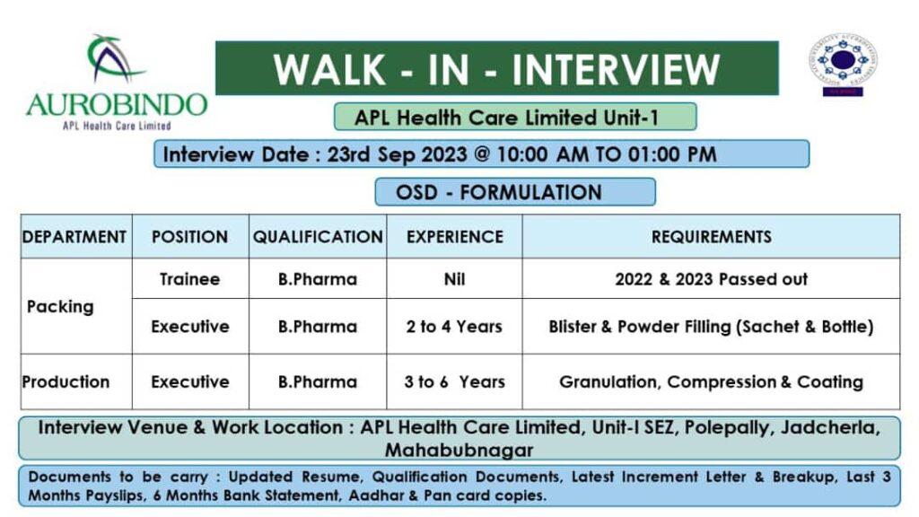 Interview Venue & Work Location: APL Health Care Limited, Unit-I SEZ, Polepally, Jadcherla, Mahabubnagar