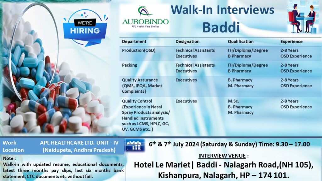 APL HEALTHCARE Walk-In Interviews at Baddi for Production, Packing, Quality Assurance & Quality Control on 6th & 7th July 2024