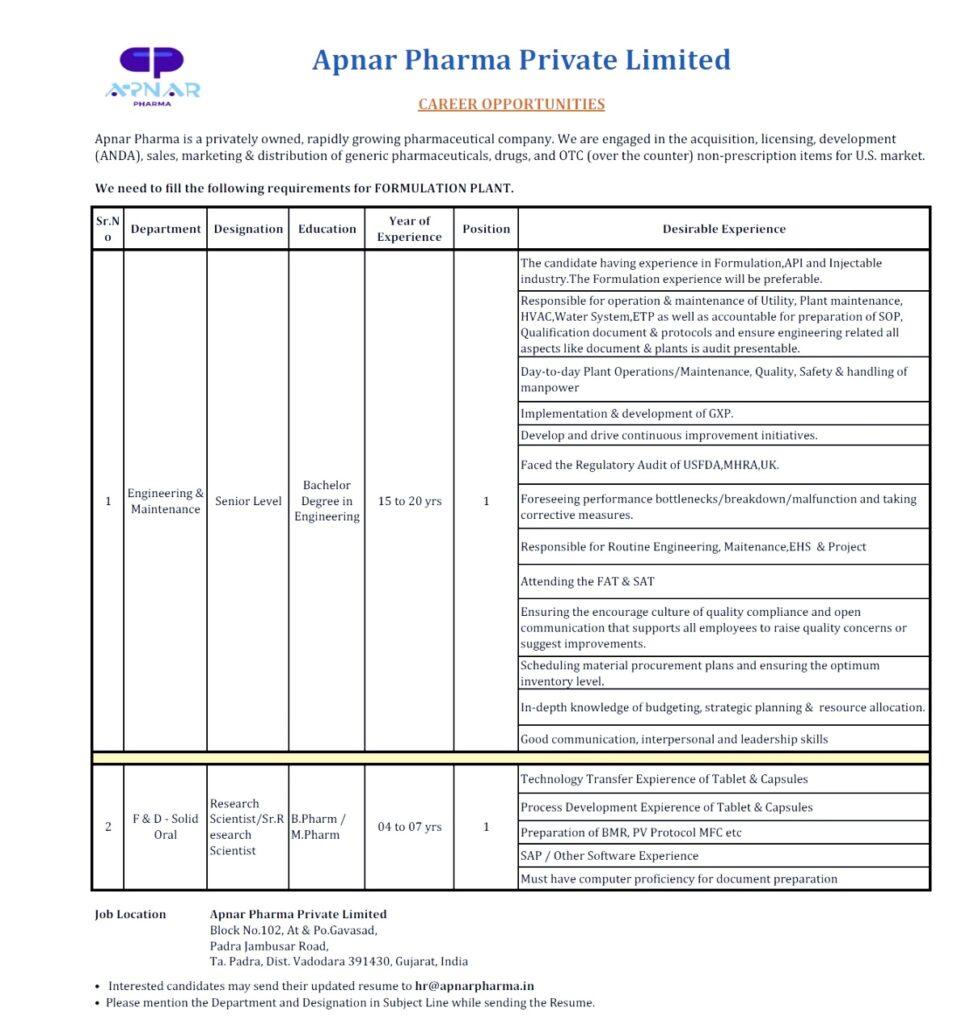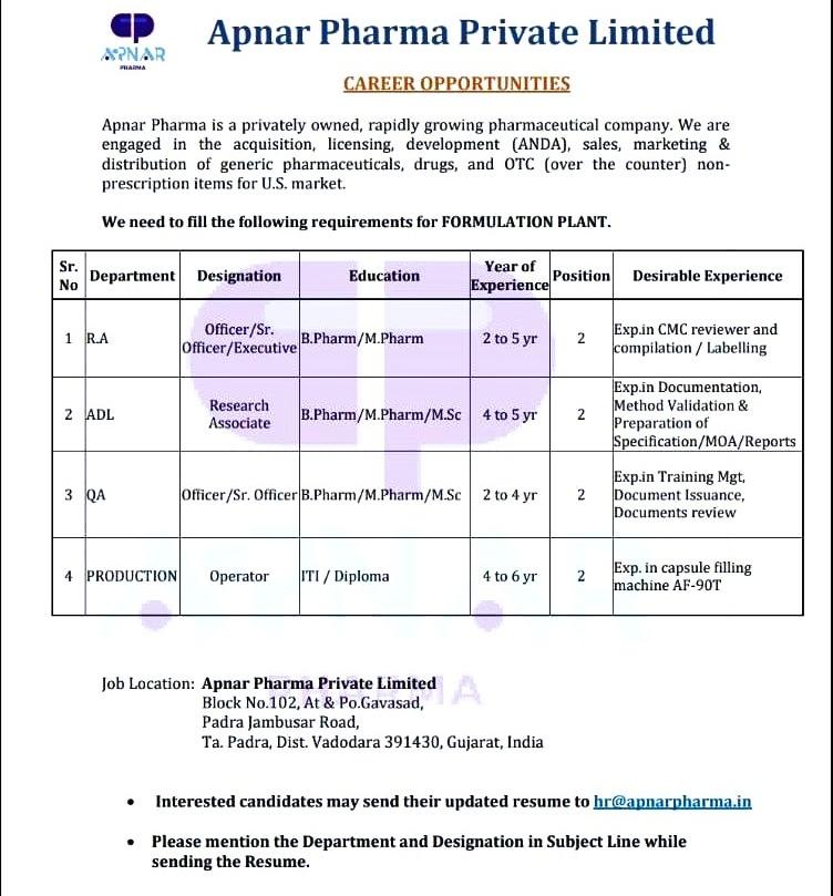 Apnar Pharma, hiring for RA/ F&D/ ADL/ QA/ Production & Engineering Department- Apply Now