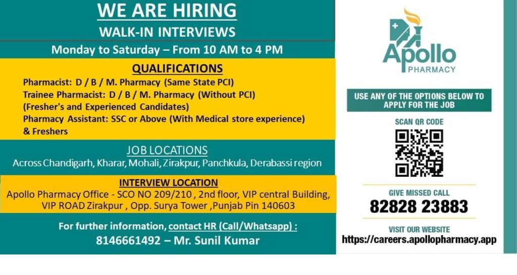 Apollo Pharmacy is conducting a walk-in interview for D.Pharm, B.Pharm, and M.Pharm freshers as well as experienced candidates at their office in Punjab. The interviews are held from Monday to Saturday between 10 AM to 4 PM.