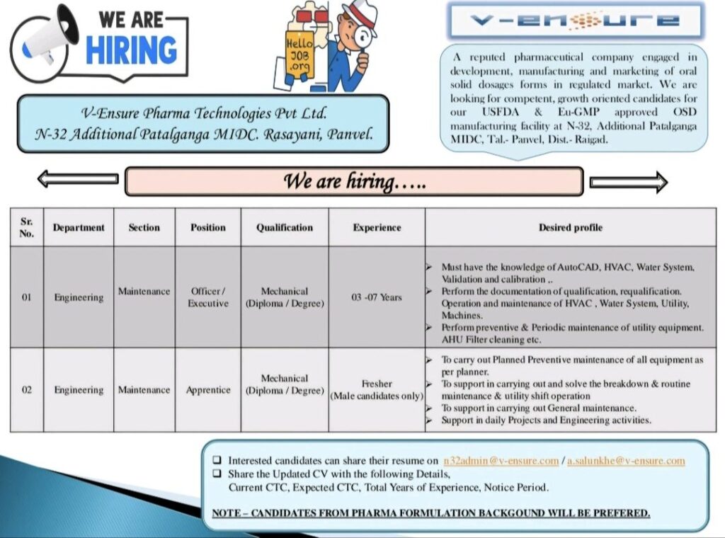 V-Ensure Pharma Technologies Pvt. Ltd., a reputed pharmaceutical company specializing in solid dosage forms for regulated markets, has announced openings in its Engineering Department at its USFDA and EU-GMP approved OSD manufacturing facility located in Additional Patalganga MIDC, Rasayani, Panvel.