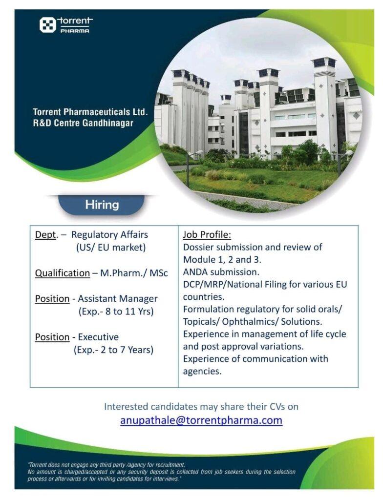 Regulatory Affairs (US/ EU market) job vacancy at Torrent Pharmaceuticals Ltd. R&D Centre Gandhinagar