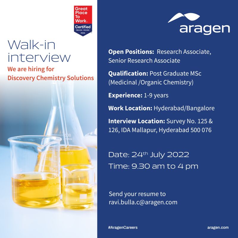 Aragen is hiring for Discovery Chemistry Solutions|| Walk In Interview on 24th July 2022
