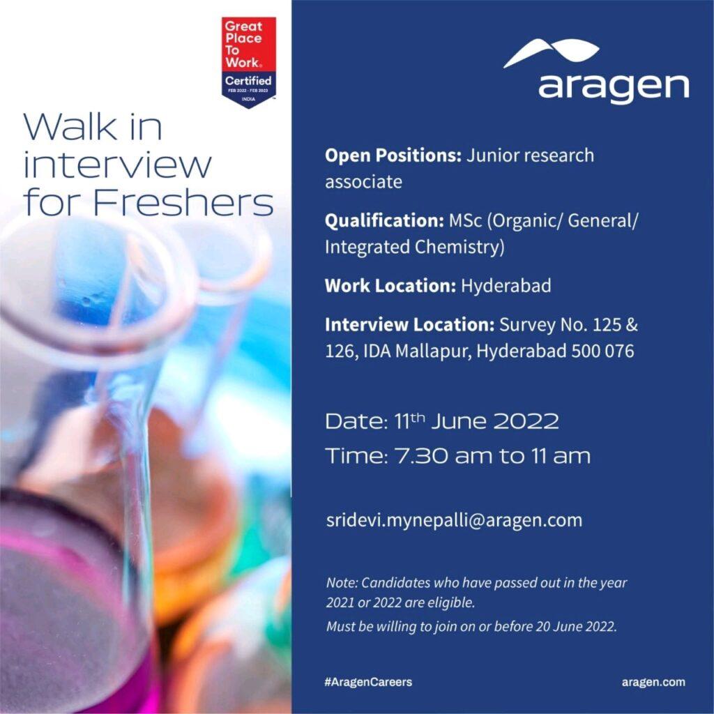 Aragen Life Sciences Walk in Drive for M.Sc Chemistry freshers ( 2022/ 2021) poassouts on 11th June 2022