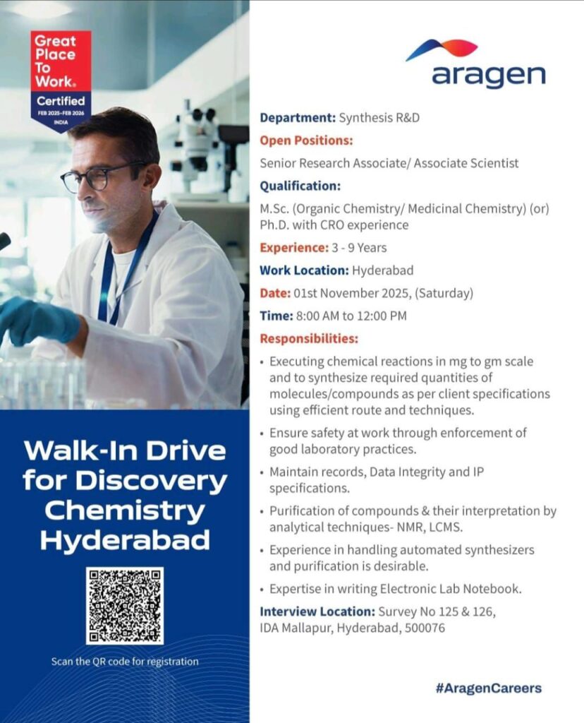 A Great Place to Work Certified global R&D and manufacturing organization, is conducting a Walk-In Drive for Discovery Chemistry roles in Hyderabad. If you’re an experienced professional in Organic or Medicinal Chemistry, here’s your opportunity to join one of India’s most innovative research environments.