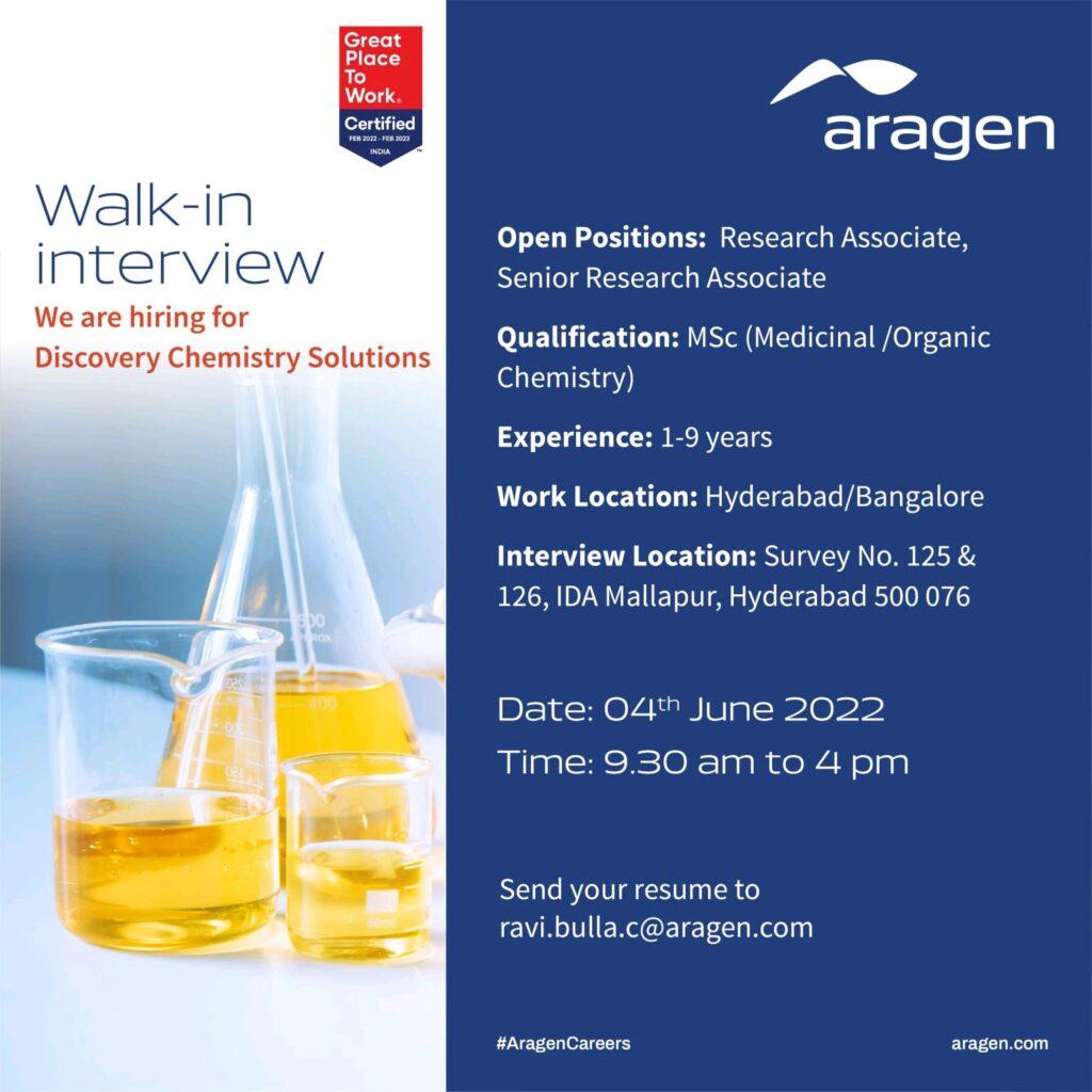 Aragen Walk In Interview for Research Associate/ Senior Research Associate/ Associate Scientist roles on 04th June 2022