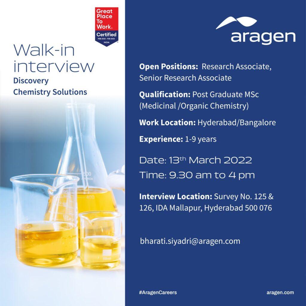 Aragen Walk In Interview for Research Associate/ Senior Research Associate- Discovery Chemistry Solutions on 13th March 2022