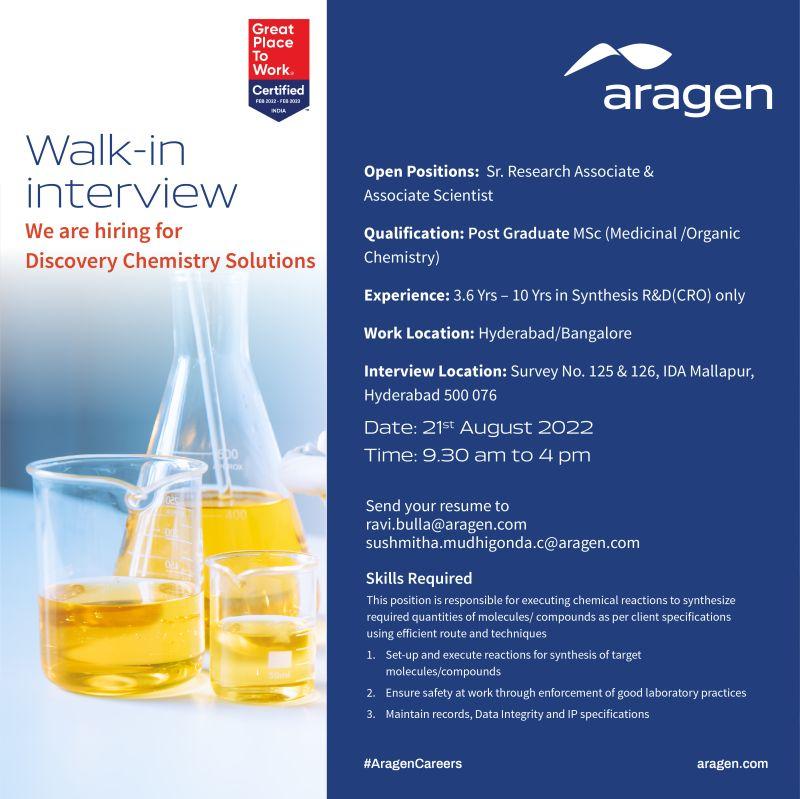 Aragen Walk-in interview for “Sr. Research Chemist & Associate Scientist” Discovery Chemistry Solutions on 21st August 2022