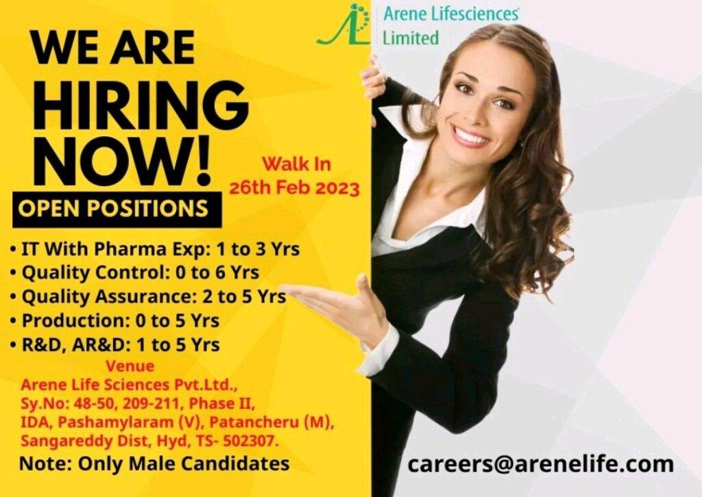 Arene Life Sciences- Walk In Interview for QA, QC, Production, IT, R&D, AR&D on 26th Feb 2023