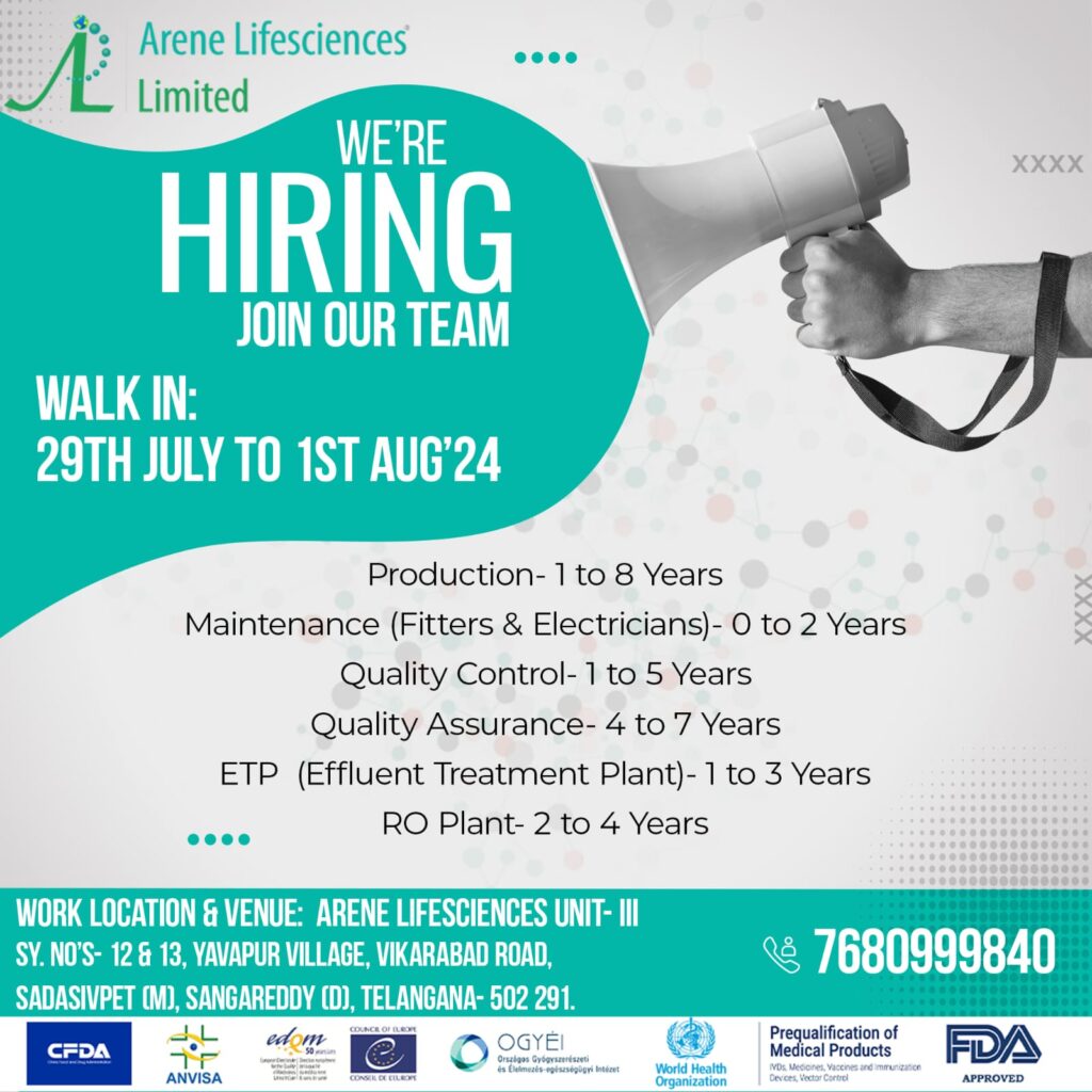 Arene Lifesciences hiring for Production, QA, QC, ETP, Maintenance, RO Plant- Walk in Interview from 29th to 1st August 2024