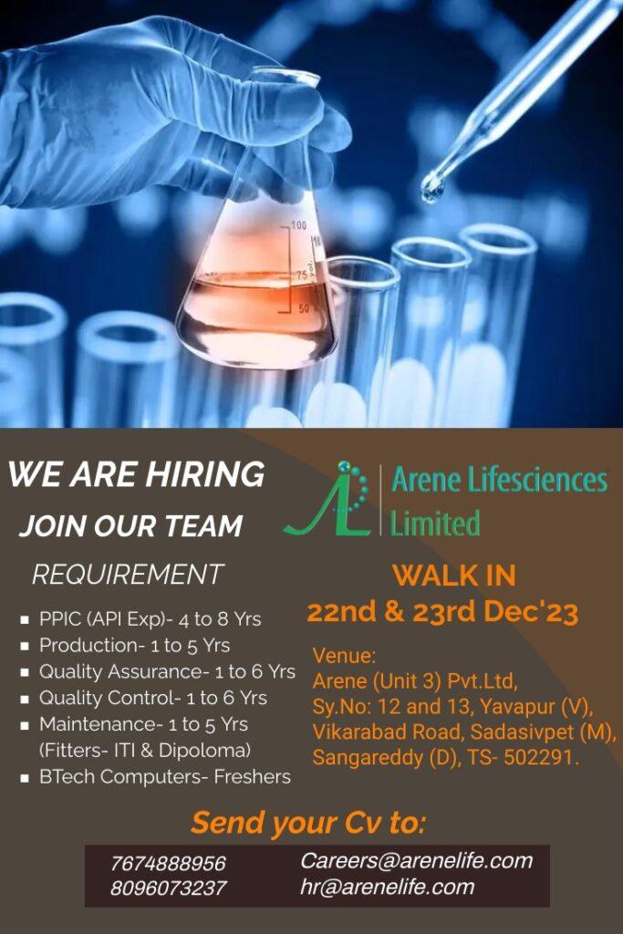 Arene Lifesciences Limited walk in interview for Production, QA, QC, PPIC & Maintenance department on 22nd & 23rd Dec’23