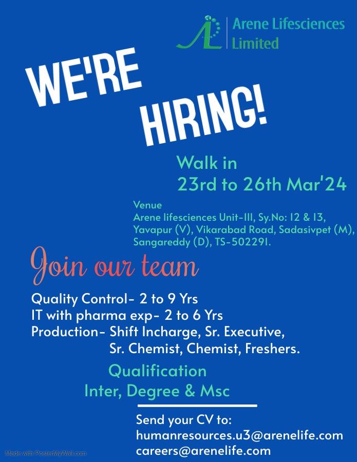 Arene lifesciences Unit-III walk in interview for Freshers & experience in Production, QC & IT on 23rd to 26th Mar 24