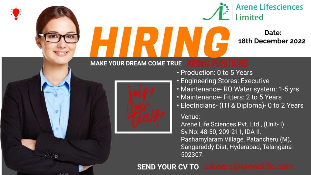 Arene Lifesciences- Walk In Interview for Fresher’s & experience in Production, Engineering Stores, Maintenance- RO Water system/ Fitters, Electricians on 18th December 2022