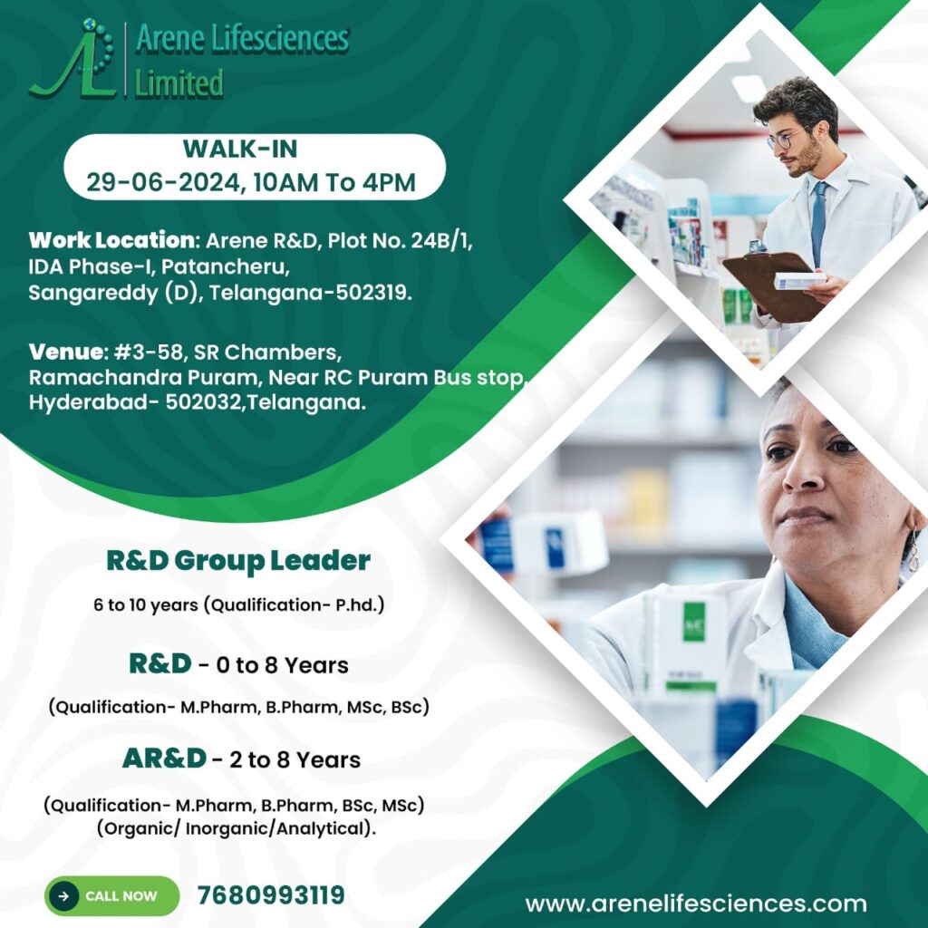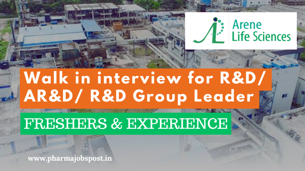Arene Lifesciences walk in interview for Freshers & Experience in R&D/ AR&D/ R&D Group Leader on 29-06-2024