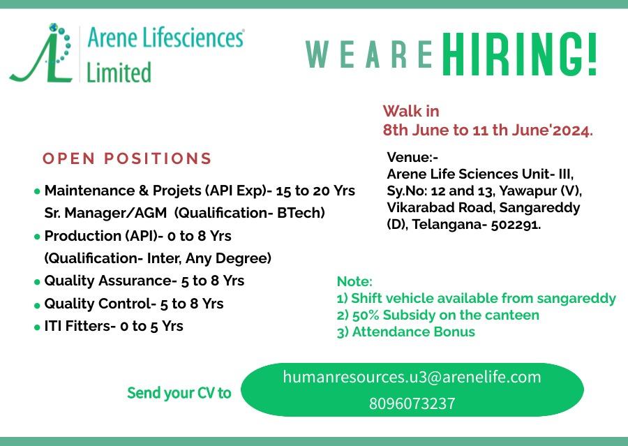 Arene Lifesciences walk in interview for QA, QC, ITI, Production, Maintenance & Projets on 8th to 11th June’2024