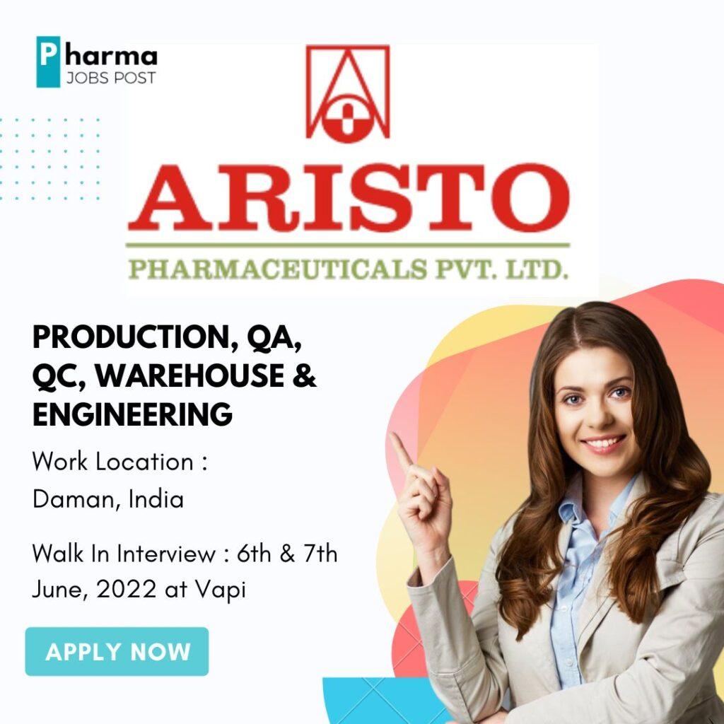 ARISTO PHARMACEUTICALS Walk In Interview for Production, QA, QC, Warehouse & Engineering on 6th & 7th June, 2022 at Vapi