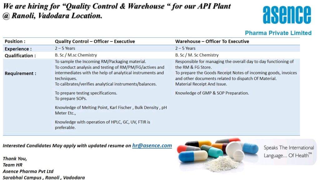 We are hiring for “Quality Control & Warehouse “for our API Plant @Ranoli, Vadodara Location.
