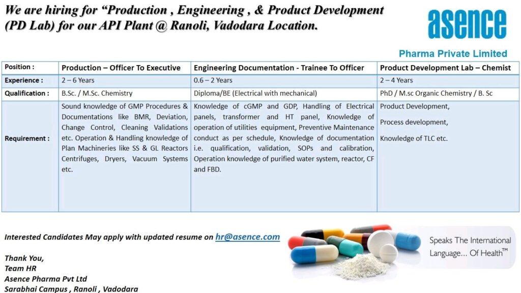 We are hiring for “Production, Engineering, & Product Development (PD Lab) for our API Plant @ Ranoli, Vadodara Location.