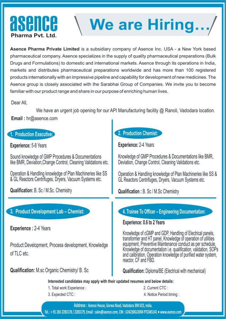 Asence Pharma urgent job opening for Production Chemist, Executive, Product Development Lab – Chemist & Trainee To Officer-Engineering Documentation