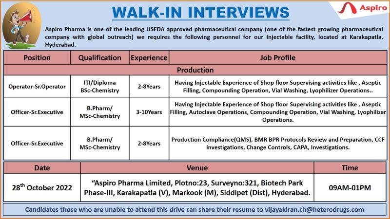 Aspiro Pharma conducting walk-in for Operator- Sr.Executive in Production Department on 28th October 2022