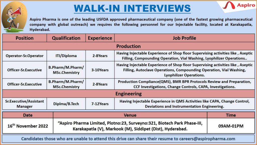 We are conducting walk-in for Production Department on 16th November 2022(Wednesday)@ Aspiro Pharma Ltd, Karakapatla, Hyderabad