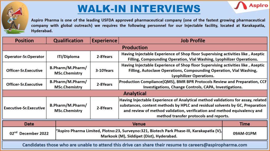 We are conducting walk-in for the following Department on 02nd December 2022(Friday)@ Aspiro Pharma Ltd, Karakapatla, Hyderabad.