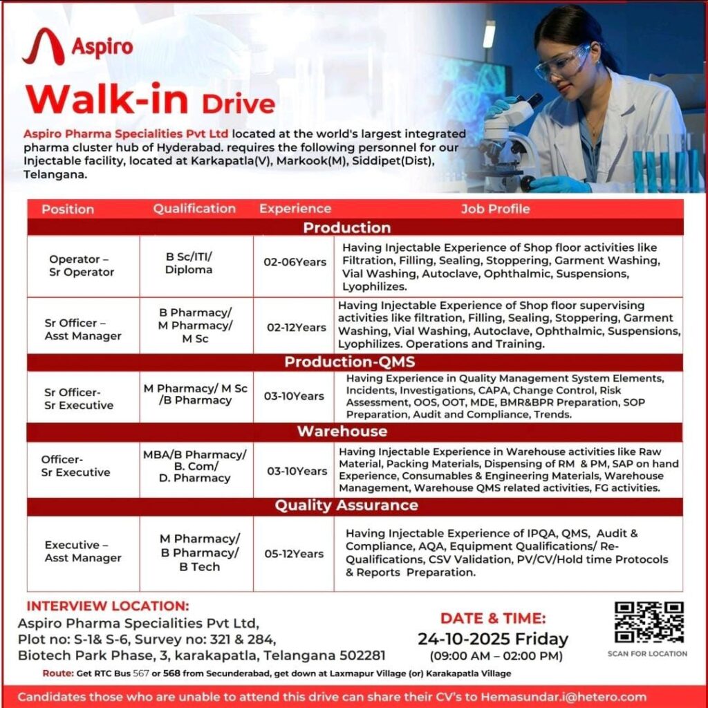 Aspiro Pharma Specialities Pvt. Ltd., one of the leading names in the pharmaceutical industry, is conducting a Walk-in Drive for various positions at its Injectable facility located in Karkapatla (V), Markook (M), Siddipet (Dist.), Telangana. The company, located at the world’s largest integrated pharma cluster hub near Hyderabad, invites experienced professionals to join its growing team.