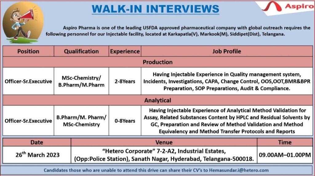 Aspiro Pharma- Walk In Interview for Freshers & experience B.Pharm/ M. Pharm/ MSc – Production, Analytical on 26th March 2023