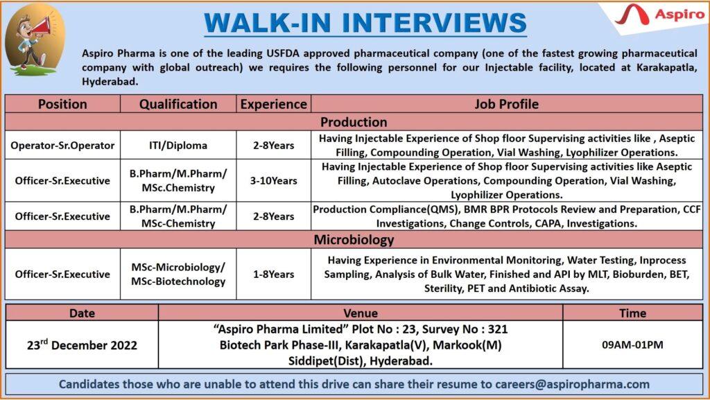 We are conducting walk-in for the following Departments on 23rd December 2022(Friday)@ Aspiro Pharma Ltd, Karakapatla, Hyderabad.