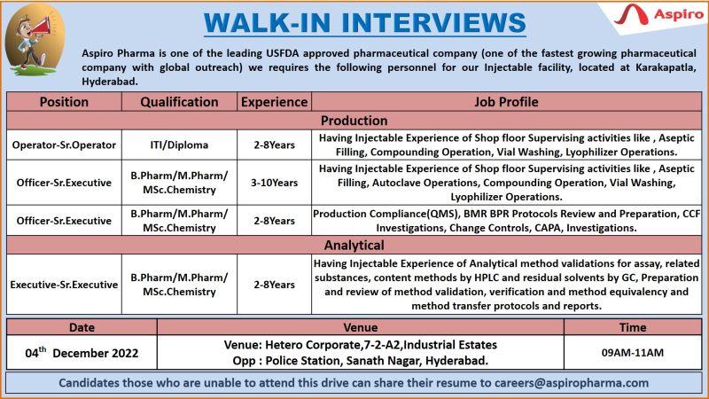 Candidates those who are unable to attend this drive can share their resume to careers@aspiropharma.com