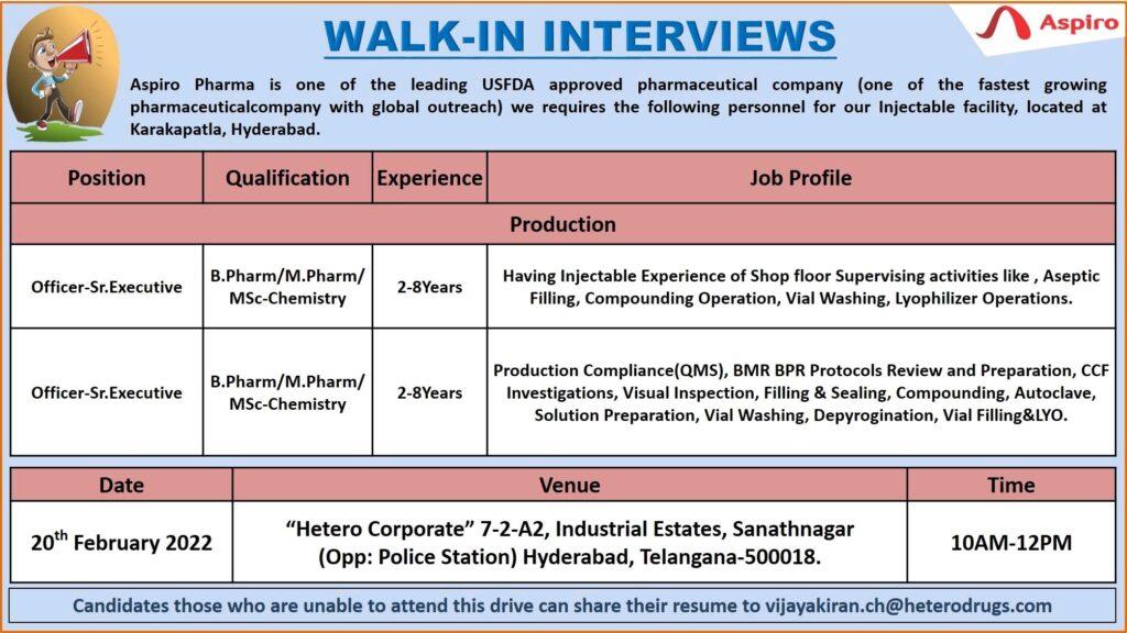 Aspiro Pharma, Walk In Interview for Production departments on 20th February 2022(Sunday)