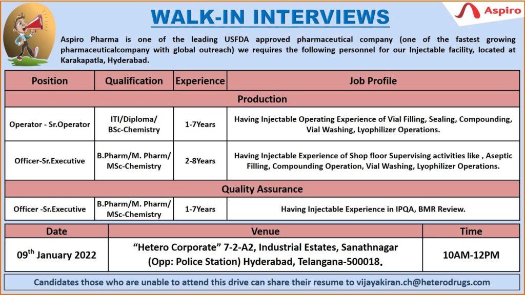 Aspiro Pharma, Walk In Interview for Production & Quality Assurance Department on 09th January 2022