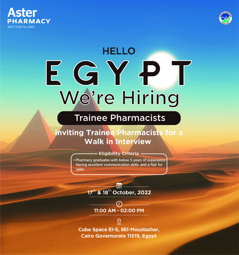 Aster Pharmacy invites applications from Trainee Pharmacists & Sales Promoters for a walk-in interview in Egypt on 17th & 18th October 2022