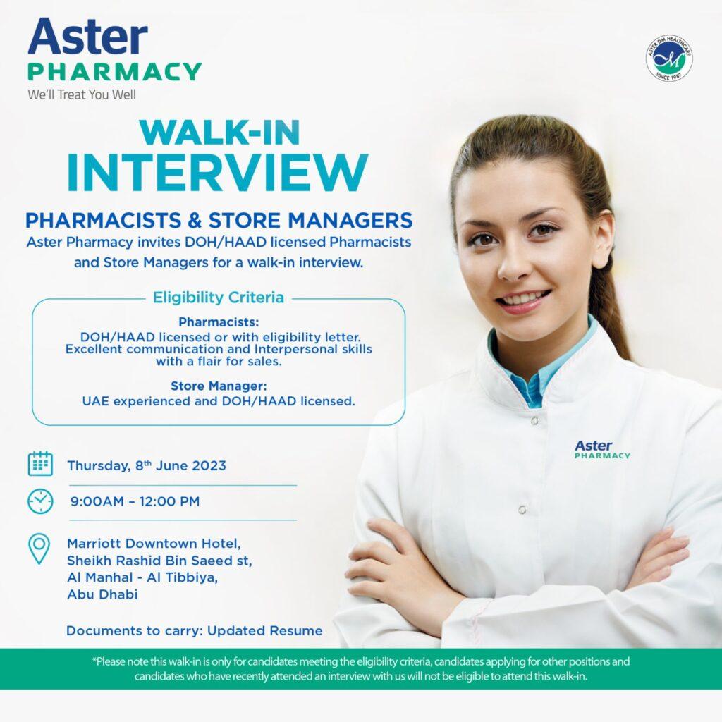 Aster Pharmacy invites DOH/HAAD licensed pharmacists and store managers for a walk-in interview on Saturday, June 8, 2023