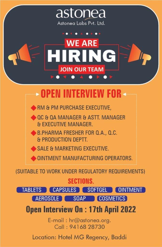 Astonea Labs Pvt. Ltd. Walk-In Interviews for Purchase / QA / QC / Sales & Marketing / Manufacturing / B.Pharm Freshers for QA, QC, Production on 17th Apr’ 2022