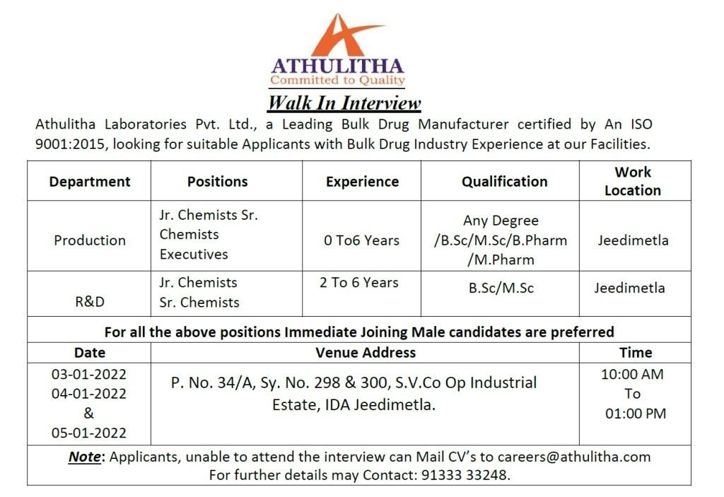 Athulitha Laboratories Pvt. Ltd, Walk-Ins for freshers & experience B.Sc, M.Sc, B.Pharm, M.Pharm, Any Degree in Production / R&D on 3rd to 5th Jan’ 2022