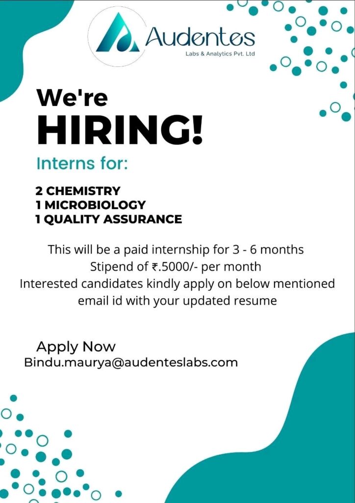 Audentes Labs & Analytics Pvt. Ltd hiring for Interns in CHEMISTRY, MICROBIOLOGY & QUALITY ASSURANCE -Internship for 3- 6 months
