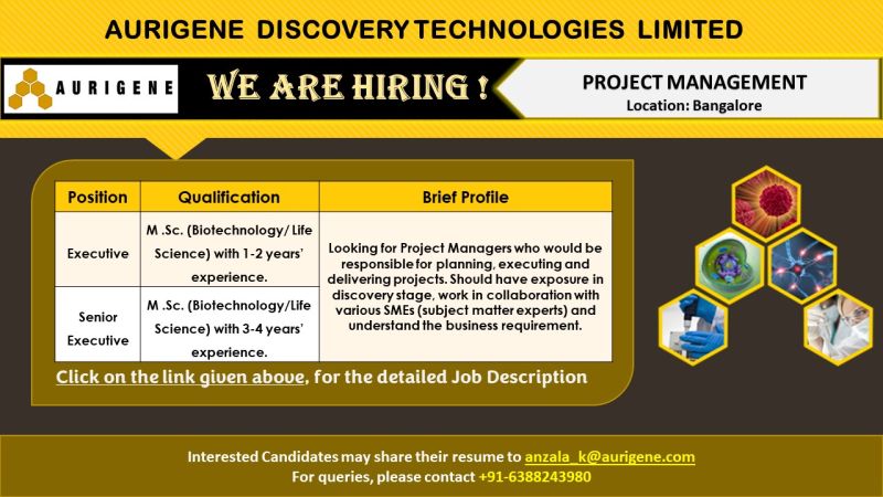 We have multiple opportunities for Project Managers and invite applications from candidates with relevant experience in managing Drug Discovery & Development programs. For detailed Job Description, please click on the link given below –