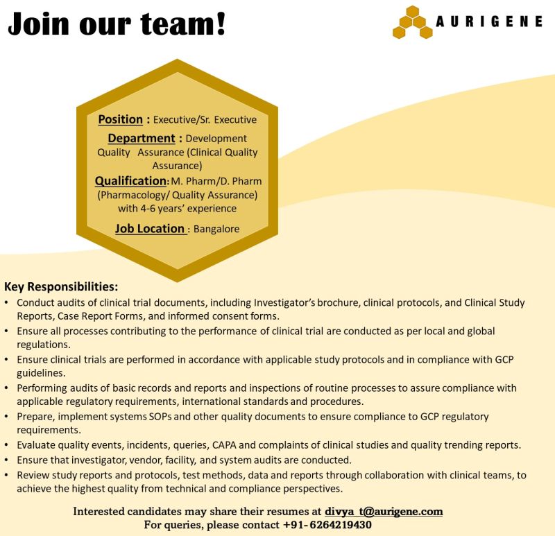 Interested candidates may directly share their profiles at divya_t@aurigene.com
