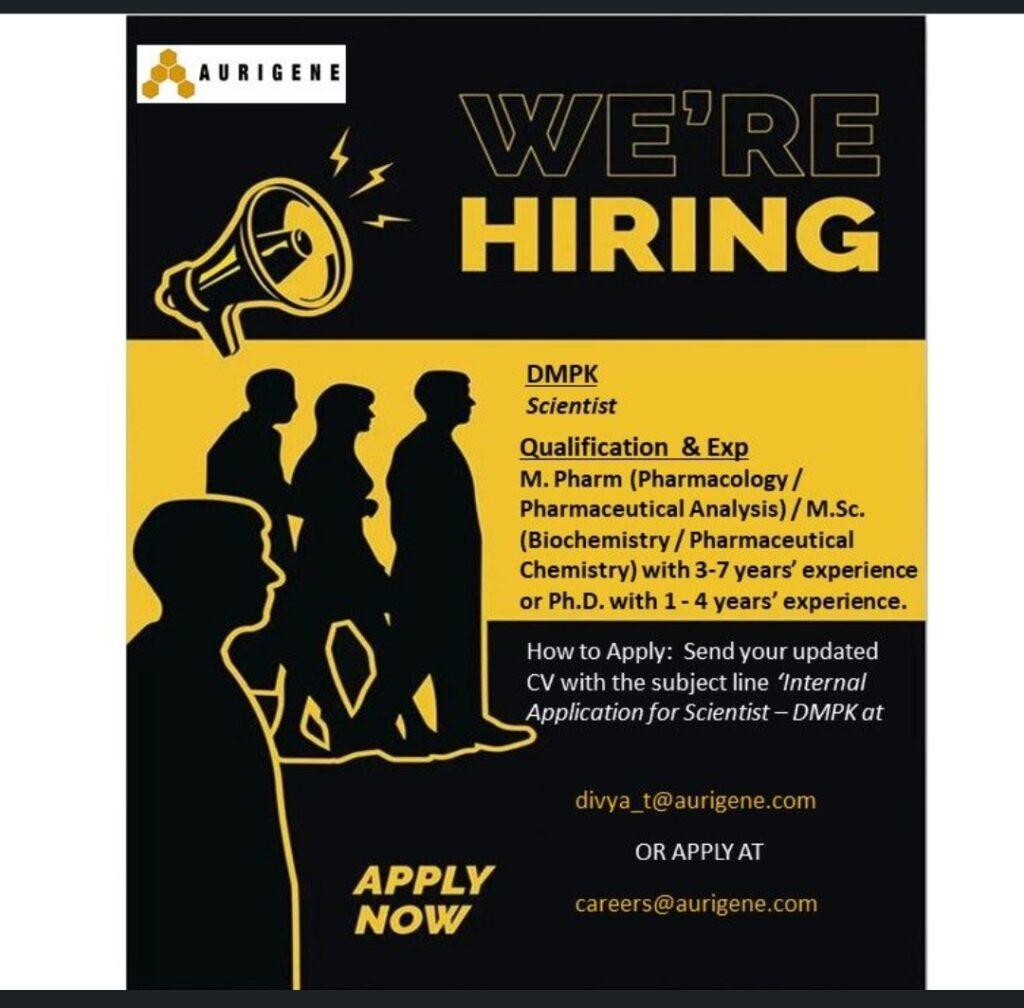 Aurigene hiring Scientist for DMPK department