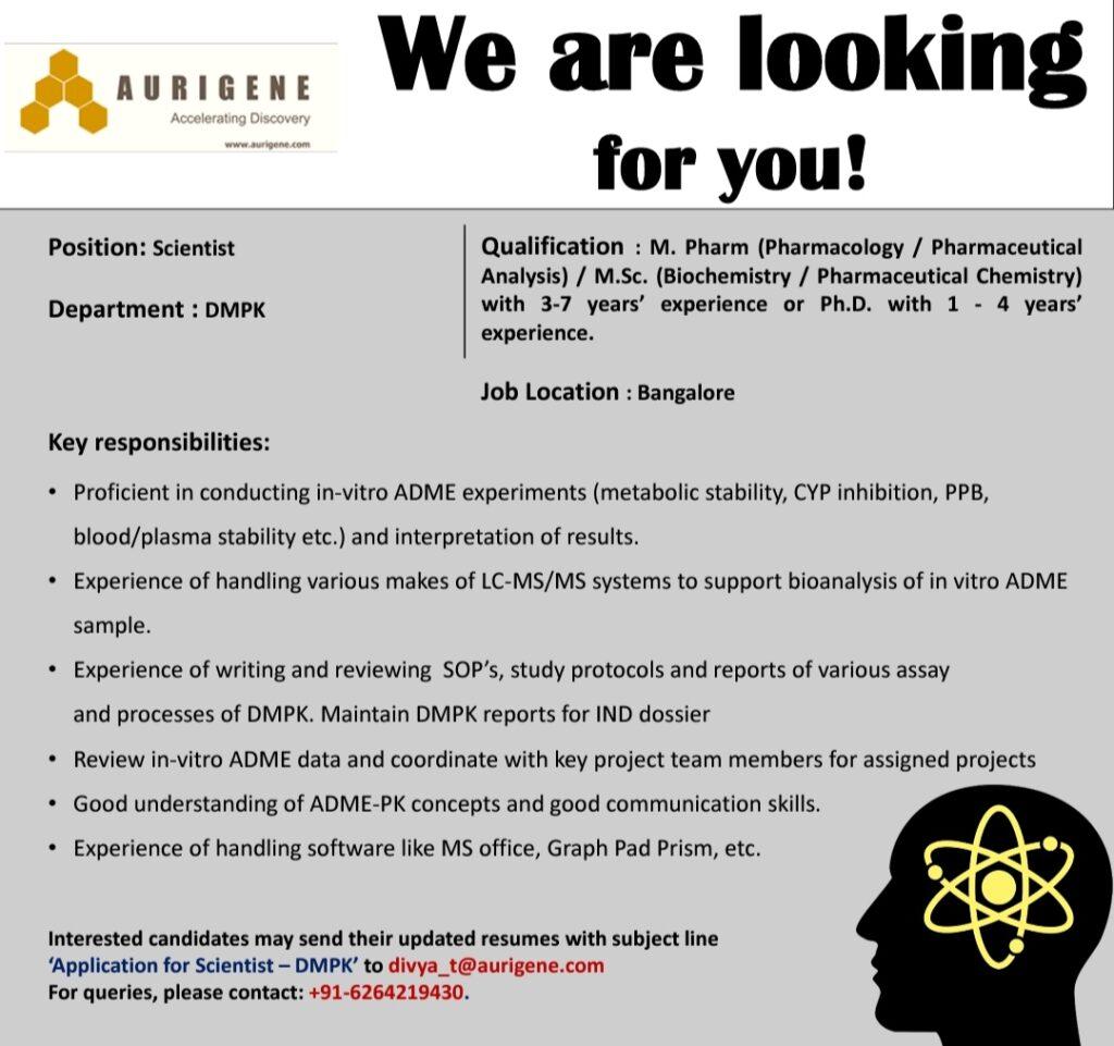 Interested candidates may send their updated resumes with subject line ‘Application for Scientist –DMPK’ to divya_t@aurigene.com For queries, please contact: +91-6264219430.