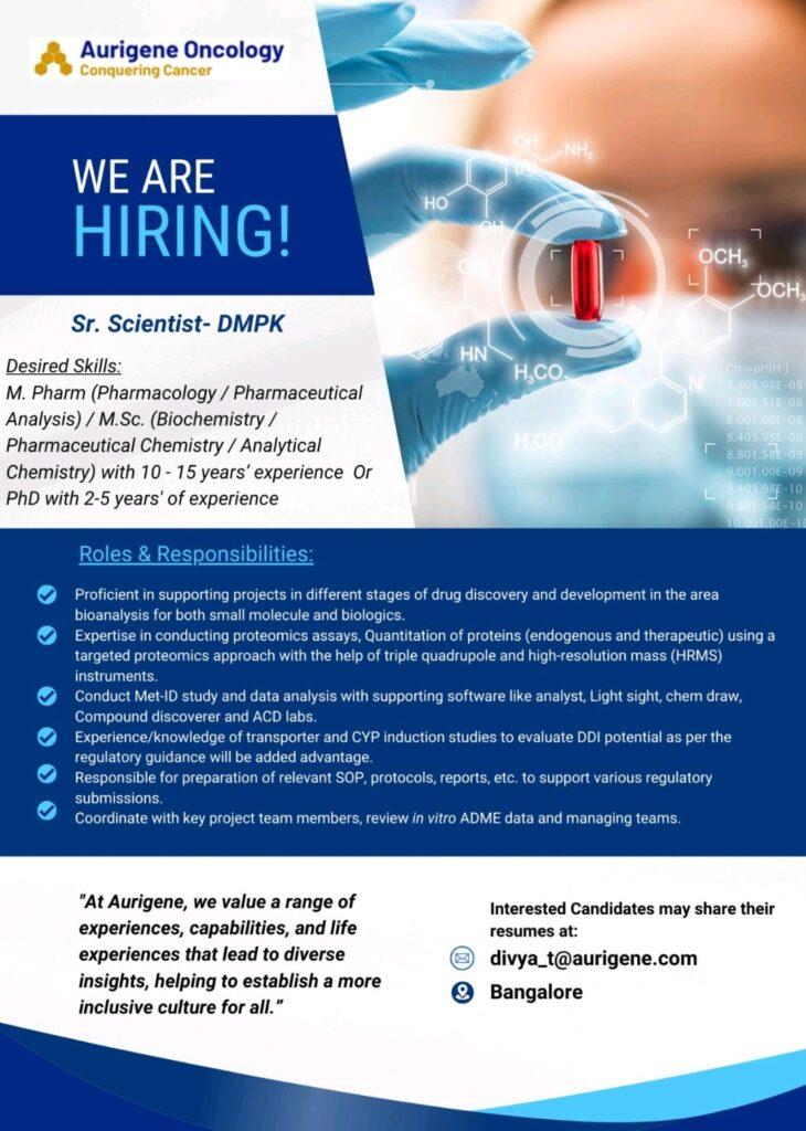 Aurigene Oncology- Hiring for Sr. Scientist- DMPK department at Bangalore