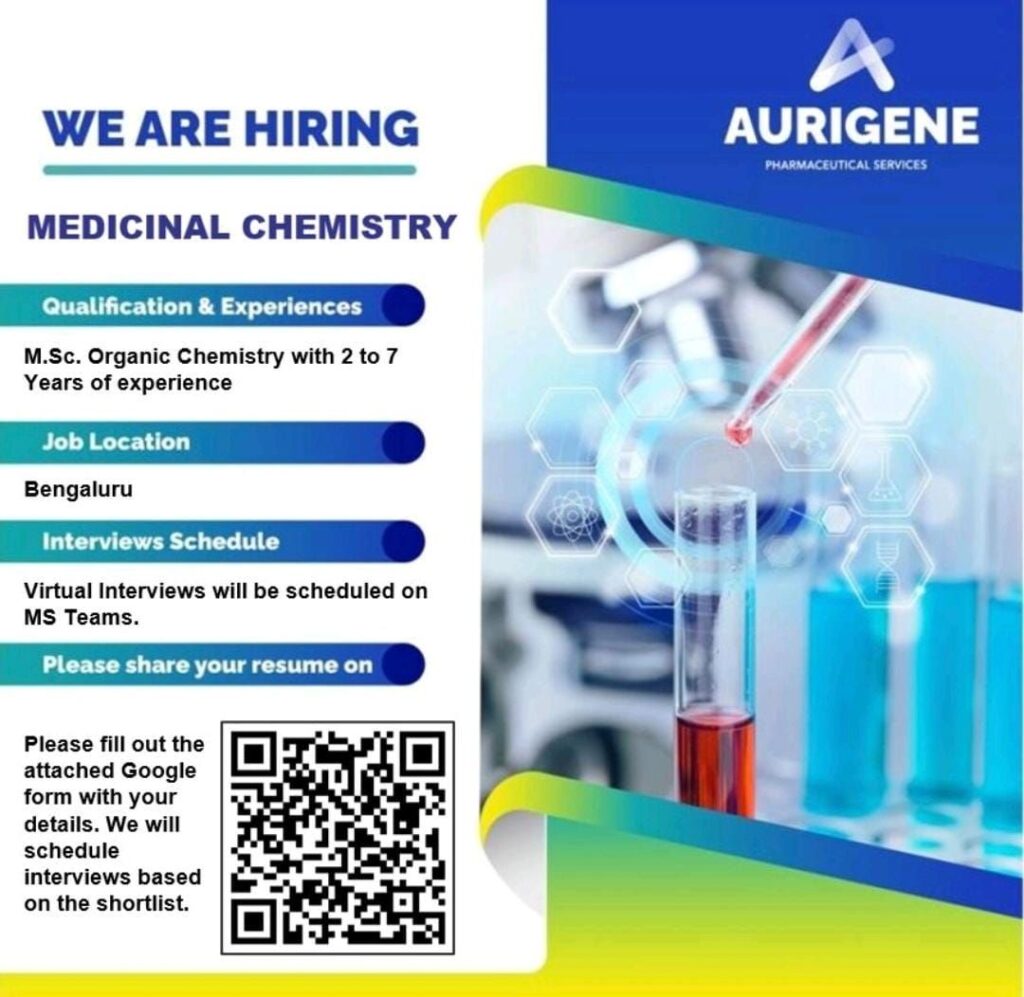 Aurigene Pharmaceutical Services, a leading name in drug discovery and development, has announced exciting job openings for professionals in Medicinal Chemistry. This opportunity is ideal for candidates passionate about research and innovation in organic chemistry and pharmaceutical sciences.